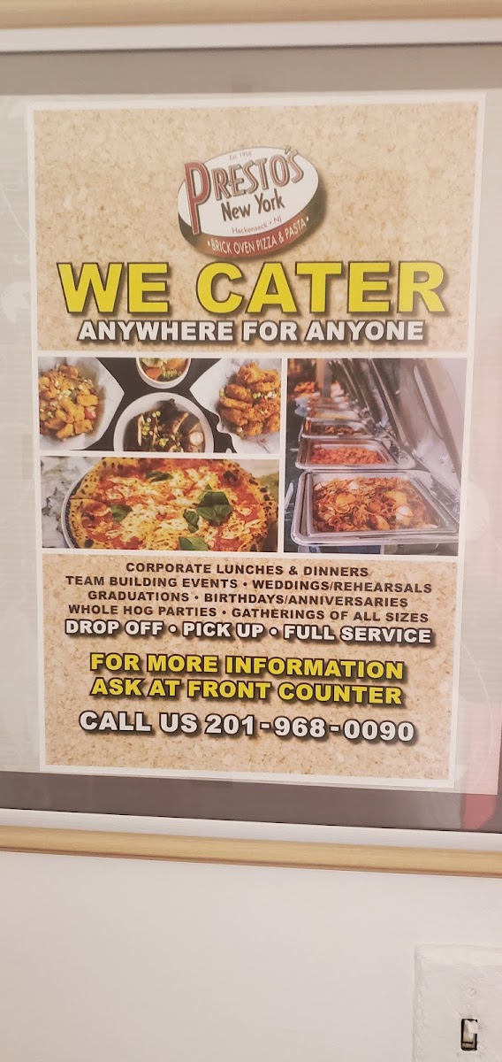 Welcome to Prestos Pizza, a gem located at 772 Main St in Hackensack, NJ. This delightful pizzeria offers a menu that stands out for its extensive variety and deliciousness. Guests rave about the ability to enjoy dual pizza options on one pie, providing a perfect way to sample different flavors in one bite. The garlic shrimp appetizer is a must-try, paired with the finest focaccia bread that enhances your dining experience.